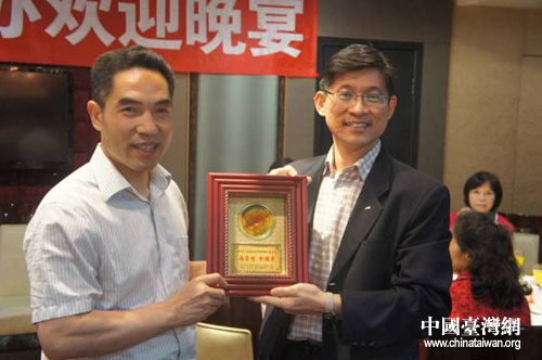 5月15日晚舉行的歡迎晚宴上,四川省臺辦副主任趙宇與臺灣參訪團(tuán)團(tuán)長李玉文先生互贈禮品。圖片來源:四川省臺辦