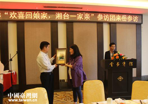 中國臺灣網10月21日岳陽消息 10月15日至20日,由湖南省委臺灣工作辦公室主辦、岳陽市委臺灣工作辦公室承辦、臺灣湖南文獻社協辦的2013“歡喜回娘家、湘臺一家親”岳陽行參訪活動在岳陽舉行。由臺灣湖南文獻社社長、岳陽籍“大陸新娘”黃國暉女士率領的40名在臺陸配歡聚岳陽,共敘鄉情友情。