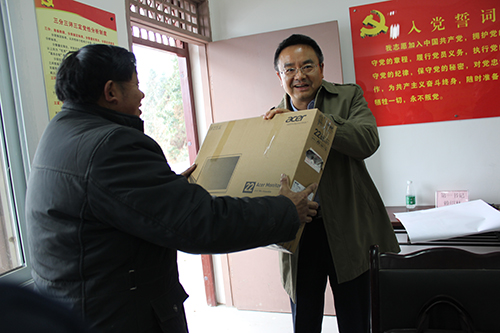 綿陽市委常委吳顯仁(右)為北川縣小壩鄉大華村贈送電腦。