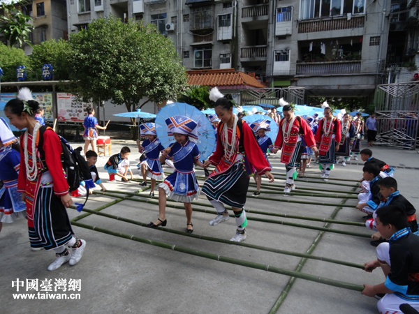 廣西河池市金城江區第三小學學生以竹竿舞迎接臺灣花蓮縣新城鄉北埔小學師生們的到來。(圖片來源:廣西河池市金城江區臺辦)