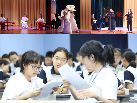 隨后,“同唱一首歌”音樂交流活動,在黃橋中學西林禮堂激情上演。在《相親相愛一家人》的動人旋律中,演出拉開帷幕。新北高中的同學們個個才藝不凡,鋼琴、小提琴、中提琴、長號、單簧管演奏,閃亮登場,異彩紛呈。尤其是小提琴獨奏馬思聰的《思鄉曲》,充滿懷念和憂傷的情調,令人無不動容。黃橋中學參演的節目更具民族風情和傳統文化氣息。二胡、古箏、古典舞、錫劇表演,充分展示出同學們的才情和風采。整場演出,可謂中西合璧、古今交融,沉靜優美的旋律在西林禮堂大廳久久回蕩,在每一個人的心頭靜靜流淌……
