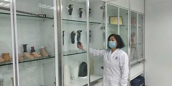 臺企德林義肢康復(fù)器材(成都)有限公司呼和浩特分公司員工復(fù)工后整理義肢產(chǎn)品展柜。(來源:內(nèi)蒙古自治區(qū)臺辦)