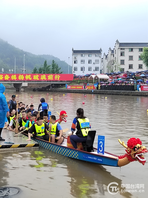 “下雨寓意著風(fēng)調(diào)雨順、端午安康。”現(xiàn)場,義烏臺青、臺聯(lián)青委組成一支12人龍舟隊(duì),隊(duì)員們高喊著“臺青同心,加油、加油”的口號,奮力揮槳,浪花激蕩心弦,岸上鼓聲震天,觀眾喝彩連連。