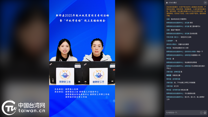 中國臺灣網10月10日訊 月圓人團圓,職等你來圓。為助力企業解決用工難題,搭建高效就業供需對接平臺,10月5日,南陽市新野縣舉行“2025年就業政策宣傳月專項活動暨中秋節專場招聘會”臺資企業直播招聘會,以“直播帶崗”形式,為企業與求職者牽線搭橋。