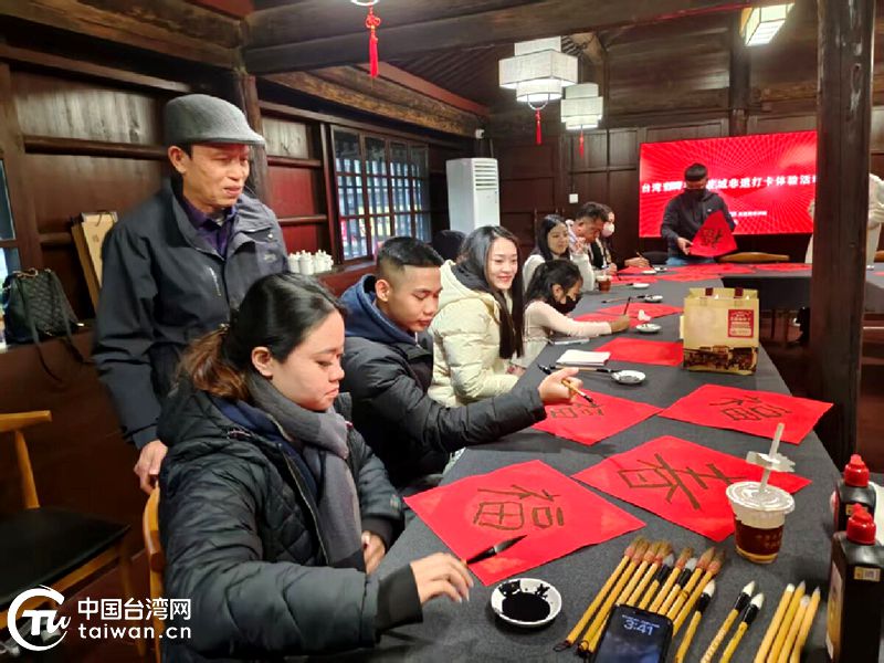 臺灣青年體驗(yàn)毛筆書法。(中國臺灣網(wǎng)發(fā))