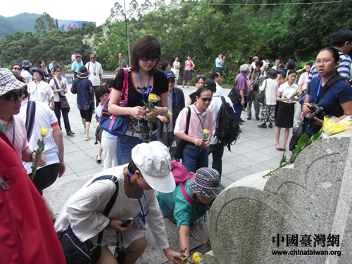 參加“情系八桂-兩岸文化聯誼行”活動的嘉賓今天來到昆侖關戰役舊址悼念先烈。圖為兩岸嘉賓在紀念牌坊前敬獻菊花。(中國臺灣網 張弛 攝)