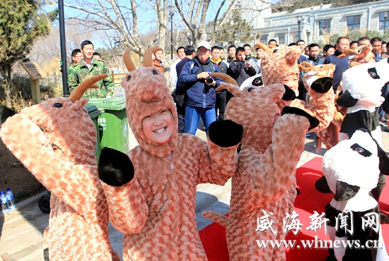 與此同時(shí),在劉公島國家森林公園的廣場(chǎng)上,各有關(guān)部門負(fù)責(zé)人正在對(duì)歡迎儀式的流程進(jìn)行推敲、演練,參加演出的鯨園小學(xué)的小學(xué)生們穿戴著梅花鹿、長(zhǎng)鬃山羊、大熊貓?jiān)煨偷姆b在現(xiàn)場(chǎng)表演,參加活動(dòng)的觀眾也在現(xiàn)場(chǎng)列隊(duì)演練。