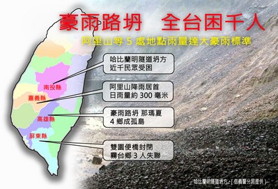 據臺灣“今日新聞”報道,臺灣梅雨鋒面發(fā)威,一整夜降下大豪雨,讓嘉義縣阿里山區(qū)累積雨量高達308毫米,造成山坡土石松動,大石頭從山頂滾落下來,把兩線道縮成一線道;另外,129線道通往新美、茶山和山美村路段便橋被大水沖毀,1000人受困等待救援。