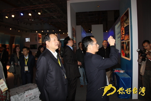 中央人民廣播電臺總編輯杜嗣坤、中央人民廣播電臺對臺灣廣播中心副主任黃少輝、中國廣播電視協(xié)會臺港澳委員會秘書長梁繼紅在展覽現(xiàn)場參觀。(你好臺灣網(wǎng) 圖)