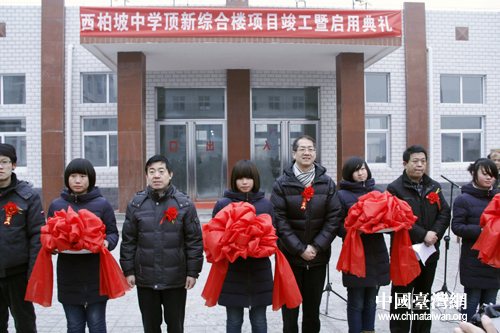 12月28日,由頂新公益基金會參與援建的河北平山縣西柏坡中學綜合樓竣工啟用,圖為騰鴻年理事長等在啟用儀式上剪彩(中國臺灣網記者 蕪同 攝)