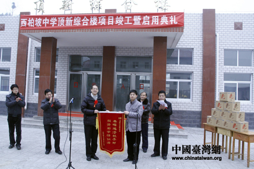 由頂新公益基金會參與援建的河北平山縣西柏坡中學綜合樓竣工啟用,圖為西柏坡中學向騰鴻年理事長贈送錦旗(中國臺灣網記者 蕪同 攝)
