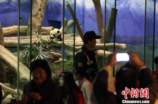 圖為與會者隔著玻璃參觀“圓仔”。 董會峰 攝