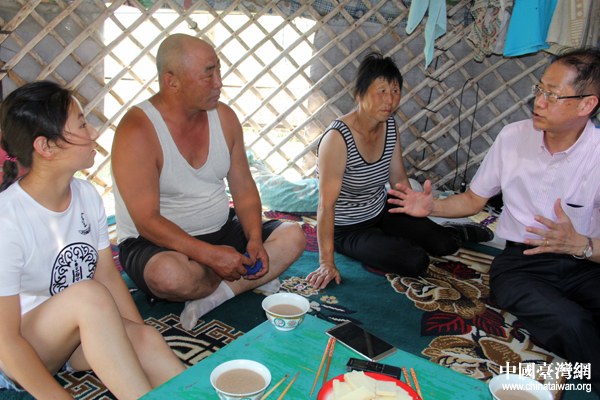 滕鴻年來到達日丹(左一)家蒙古包,與其父母話家常。(中國臺灣網 王思羽 攝)