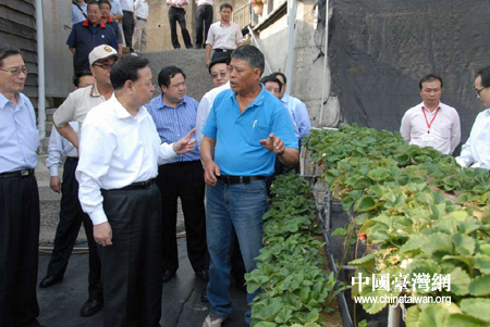 在武榮村山頂果園農場里,農戶范銹龍向羅清泉一行介紹了發展觀光農業,銷售主要通過網路訂購和團體采購,草莓生產主要采取高架栽培方式,以及通過農會獲取農業創業貸款等情況。羅清泉饒有興致地聽著,并仔細詢問了果苗病害防治、農村飲水、污水處理、農民就醫等問題。他熱情稱贊范銹龍懂技術、善管理,是一位高素質的新型農民。認為農會組織在地方政府、市場和農戶間搭起了一座溝通的橋梁,這種組織方式值得借鑒。他還熱情邀請范銹龍先生到湖北來給農村干部和農民講課,開展農業技術交流。