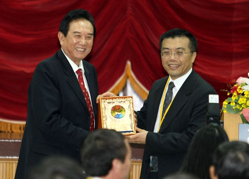 座談會上,高雄市經貿發展協會會長葉致中致辭歡迎海協會參訪團并與陳云林互贈禮品。