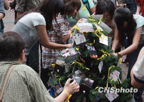 5月13日,“紀(jì)念汶川地震兩周年暨玉樹地震周月”全臺陸生聯(lián)合紀(jì)念活動在臺灣世新大學(xué)啟動,這是在臺陸生第一次跨校聯(lián)合舉辦活動。臺灣的清華大學(xué)、交通大學(xué)、世新大學(xué)、義守大學(xué)、輔仁大學(xué)等高校數(shù)百名來臺短期研修的陸生,與臺灣同學(xué)一道,為汶川祈福,為玉樹祈福,為兩岸同胞祈福。圖為兩岸學(xué)子在世新大學(xué)紀(jì)念活動現(xiàn)場的祝福樹上系黃絲帶、掛祝愿卡。中新社發(fā) 羅欽文 攝
