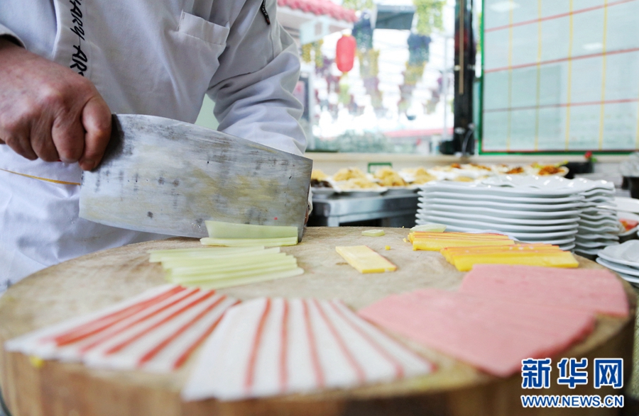 在青!袄习吮P”中,最具代表的一道菜就是全盤,是由熟菠菜、肉絲、熟豆芽、粉絲、胡蘿卜和肉片、筍片、午餐肉和熟雞蛋等組成的涼菜拼盤。范增福正在將擺盤的食材切成長方形。
