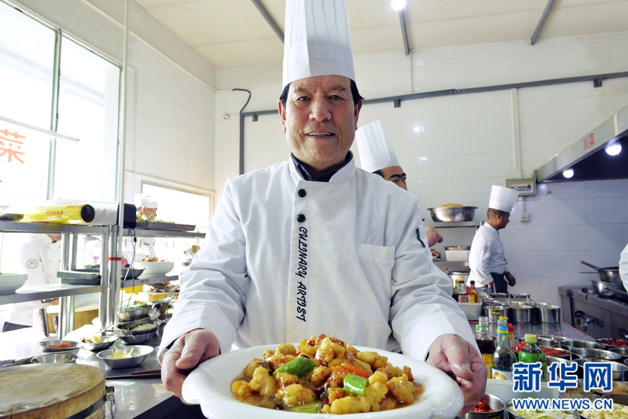 范增福端著剛剛烹制完成的酸辣里脊。這道菜金黃香脆,酸辣可口。