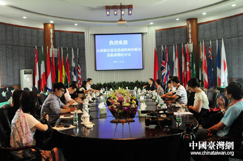 參加天府新區(qū)采訪活動的兩岸媒體記者在成都經(jīng)濟技術(shù)開發(fā)區(qū)座談采訪。(圖片來源:四川省臺辦)