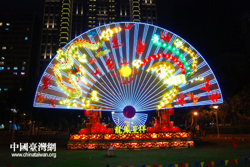 中國臺灣網3月13日臺中消息 2013年2月18日至3月3日,中臺灣元宵燈會在臺中市文心森林公園舉行,吸引臺灣民眾560萬人次前往參觀。四川自貢彩燈繼去年首次亮相2012中臺灣元宵燈會即驚艷全島后,今年蛇年春節,再度受邀赴臺參展,特制了《吉祥平安》、《龍鳳呈祥》、《國色天香》三組特色彩燈為2013中臺灣元宵燈會再增光彩,其中《吉祥平安》大型象形花燈光彩奪目,在臺灣民眾中更是再次引起轟動。