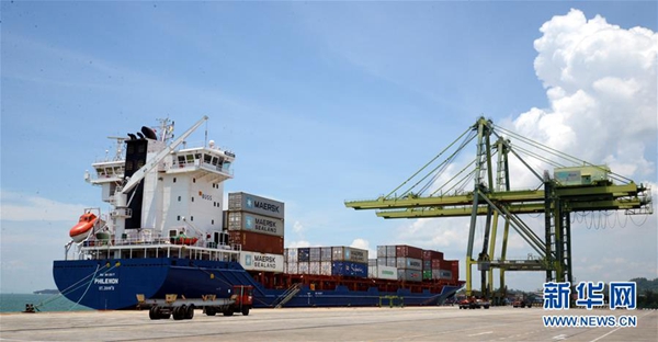 這是2015年4月17日拍攝的距離文萊首都斯里巴加灣29公里的摩拉港集裝箱碼頭。記者 鄭捷 攝