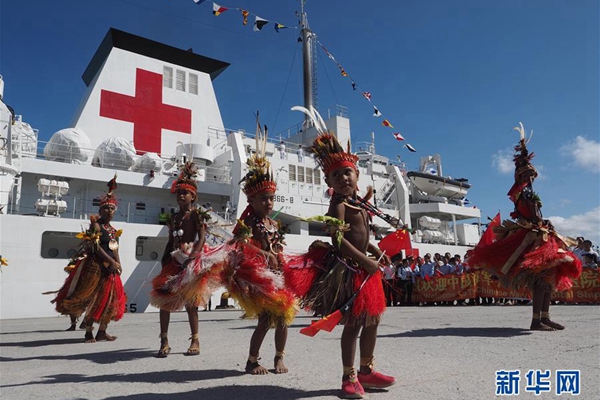 7月11日,在巴布亞新幾內亞首都莫爾茲比港,當地民眾跳起傳統舞蹈,歡迎中國海軍和平方舟醫院船。執行“和諧使命-2018”任務的中國海軍和平方舟醫院船11日駛抵莫爾茲比港,開始對巴新進行為期8天的友好訪問并提供人道主義醫療服務。(江山 攝)
