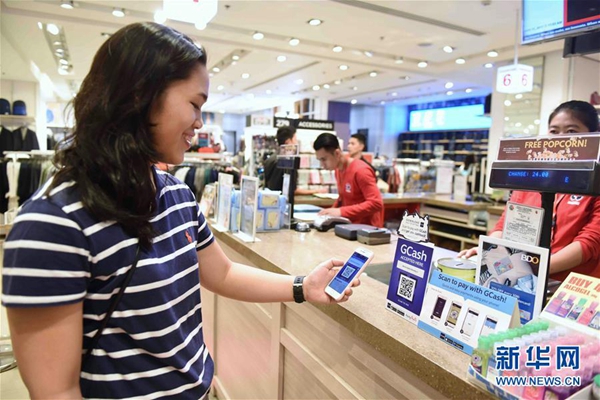 2017年11月11日,在菲律賓馬尼拉一家商場,消費者使用GCash電子支付系統付款。與阿里巴巴合作的GCash被稱作“菲律賓版支付寶”。記者 秦晴 攝