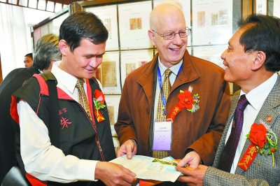 日前,在尤溪縣“中華傳統(tǒng)文化兩岸集郵展覽”展廳里,來自臺灣新竹縣的朱金得(左)與觀展嘉賓交流集郵心得。
