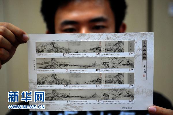 這是2010年《富春山居圖》成畫660周年之際首發的《富春山居圖》特種郵票。該郵票以《富春山居圖》整幅畫卷為藍本(5月11日攝)。當日,元代黃公望《富春山居圖》(剩山圖)在浙江省博物館點交啟運,將經由北京后赴臺,于6月1日在“山水合壁——黃公望與《富春山居圖》特展”上,與臺北故宮博物院所藏《富春山居圖》(無用師卷)聯合展出。這將是該畫作兩部分在分別360年后首次實現合璧。新華社記者 韓傳號 攝