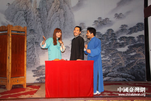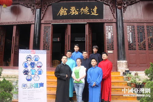 中國臺(tái)灣網(wǎng)7月13日貴陽消息 長(zhǎng)衫、布鞋、折扇、醒木、手絹、快板,這幾個(gè)關(guān)鍵詞勾勒的,可不是一板一眼站在臺(tái)前說相聲的老夫子,而是幾個(gè)“80后”的年輕人——穆伍、洪方舟、陳丹等。每月第一、三周六晚上的8點(diǎn),在貴陽市達(dá)德書院,“春黔相聲工作室”的幾個(gè)80后年輕人會(huì)身穿長(zhǎng)衫,手拿快板,用夾雜著現(xiàn)代詞匯的“傳統(tǒng)相聲”來博得滿場(chǎng)的喝彩。通過網(wǎng)絡(luò)了解到貴陽有這樣一群熱愛、傳承中華傳統(tǒng)藝術(shù)的年輕人,臺(tái)灣東森電視臺(tái)《生活接力棒》欄目組便來到這里對(duì)他們進(jìn)行采訪,希望向廣大觀眾傳遞一種精神——夢(mèng)想與堅(jiān)持。