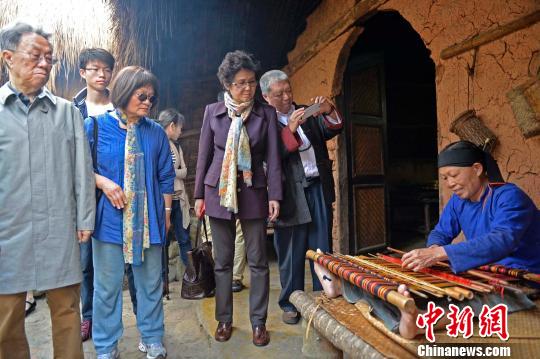 兩岸藝術家在景區觀看黎族阿婆織黎錦。 駱云飛 攝