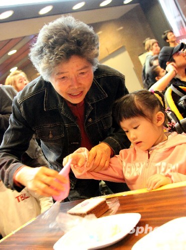 每年元月第二個星期日是臺灣阿公阿嬤節,這個由民間發起的節日已經邁入第五年,鼓勵大小孫子經;丶遗惆⒐叱燥垐F圓。圖為臺北一場名為“2010年阿公阿嬤食在好幸!被顒又校晃话吆蛯O女在一起制作蛋糕。中新社發 曾嘉 攝