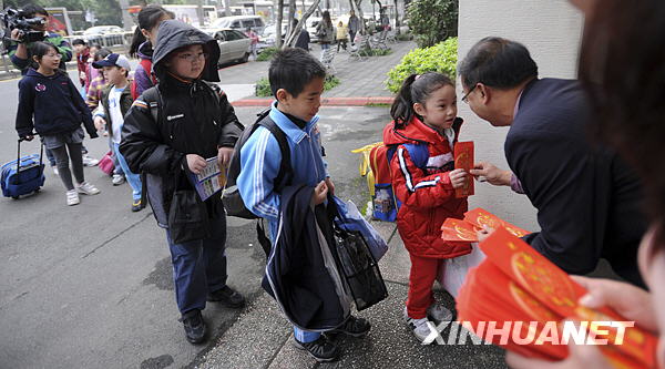 2月22日,在臺北市東門小學校門口,校長和老師發福袋迎接學生。當日,臺北市東門小學的學生結束寒假,重返校園。新華社發(吳景騰 攝)