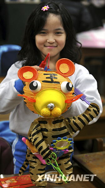 2月22日,臺北市東門小學的學生帶著寒假作業虎年花燈到學校上課。新華社發(吳景騰 攝)