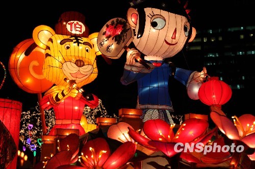 圖為根據中國古代傳說制作的花燈“保生大帝醫虎喉”。中新社發 耿軍 攝