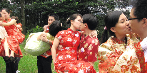 七夕情人節(jié),寧波市20對(duì)新人情定日月潭,還在植樹(shù)紀(jì)念后,由新郎抱起身著旗袍的新娘熱情擁吻,羨煞旁人。