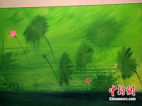 陳歡畫作:風中荷花油彩 夏毅 攝
