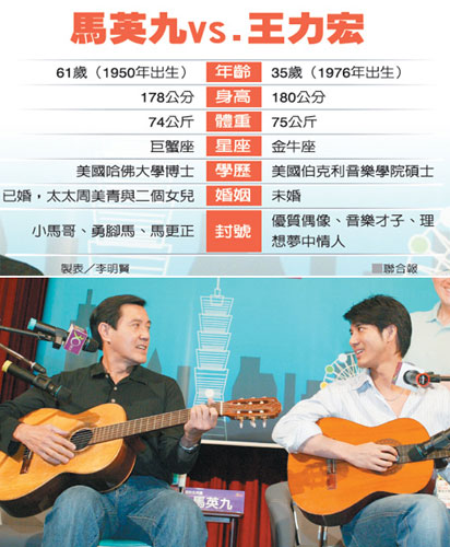 馬英九、王力宏兩位“師奶殺手”將在臺灣“清華大學”校慶對談,有網友建議合唱“龍的傳人”。圖為2007年兩人在“兩世代偶像對談”會上,合彈吉他共唱英文歌曲。圖片來源:臺灣《聯合報》