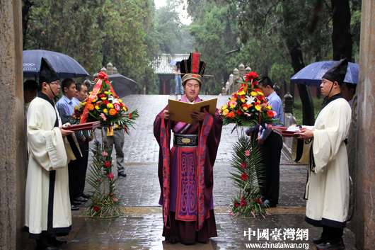 兩岸文化界人士雨中祭拜孔子圣人。(中國臺灣網 芮益芳 攝)