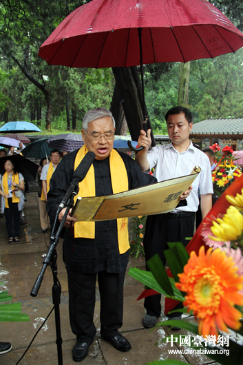 “情系齊魯——兩岸文化聯誼行”臺灣嘉賓團顧問、臺灣世新大學講座教授曾永義現場恭讀祭文。(中國臺灣網 芮益芳 攝)
