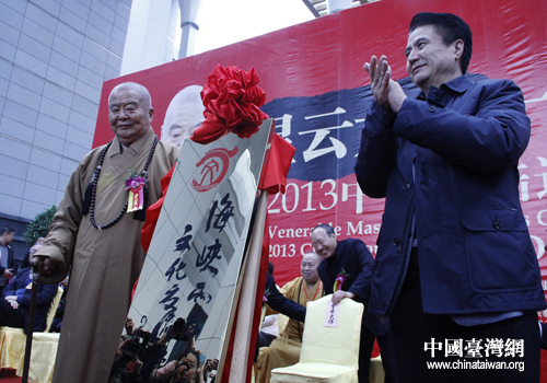 海南省委書記、省人大常委會主任羅保銘,臺灣佛光山開山宗長星云大師為海峽兩岸(海南)文化交流聯合會和一筆字書法展揭牌(中國臺灣網 馬萌攝)