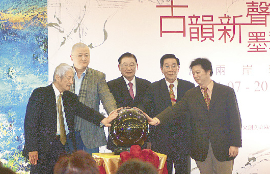 “古蘊新生·墨彩華章”兩岸書畫展昨天在臺北圓山飯店開幕,前海基會董事長江丙坤(中)、陜西省西安美院國畫系主任姜怡翔(左二)、臺灣油畫大師陳景容(左一)、中華經貿文創交流協會理事長江清香兼、藝術家劉俊成(右一)等人共同啟動。(來源:臺灣《旺報》)