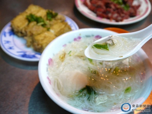 臺北的米粉湯許多都是使用粗短的米粉,口感軟中帶勁,這邊選用新竹的米粉烹煮,細細長長,帶有一點點的脆度,吸附著加了芹菜、油蔥的湯汁,爽口不膩,還有一股股清淡的油香,店家還添上了旗魚肉碎塊還有一顆福州丸,可以配著一起食用。