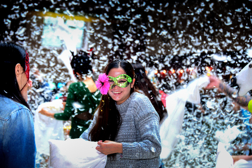 午休時,戴上面具的員工們還玩起了枕頭大戰,千古情主題酒店的大堂飄起了一場“鵝毛大雪”,戴上面具后大家不再有職位上的區別,甚至公司的總經理也加入到了這場枕頭大戰之中。每個人都不甘落后,揮起枕頭,用“柔軟的暴力”,盡情宣泄生活的壓力。