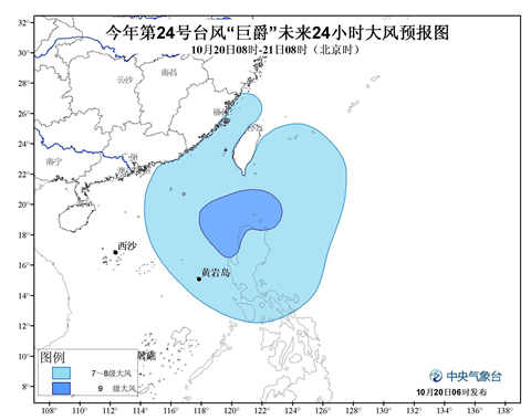 中央氣象臺預計,20日8時至21日8時,受"巨爵"和冷空氣的共同影響,臺灣海峽、臺灣以東洋面、巴士海峽、南海東北部和中東部海域將有7~8級、陣風9~10級的大風,"巨爵"中心經過的附近海域風力將有9級、陣風可達10~11級,東海南部海域將有5~7級、陣風8級的東北風,南海東南部海域將有5~6級西北風。另外,渤海將有5~7級、陣風8級的東北風。