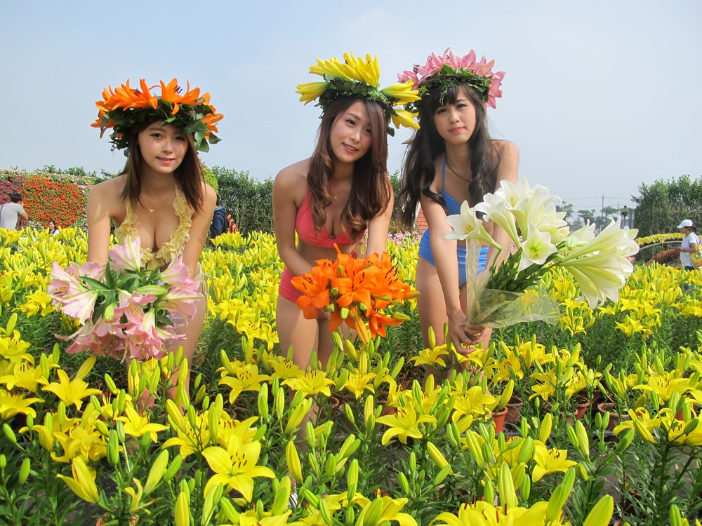 臺(tái)中后里區(qū)中社觀光花市自荷蘭引進(jìn)50多種百合花球莖,利用低溫技術(shù),讓百合花提前一個(gè)月開(kāi)花,29日開(kāi)幕式上,請(qǐng)來(lái)比堅(jiān)尼辣妹與百合花爭(zhēng)艷。圖片來(lái)源:臺(tái)灣“中央社”