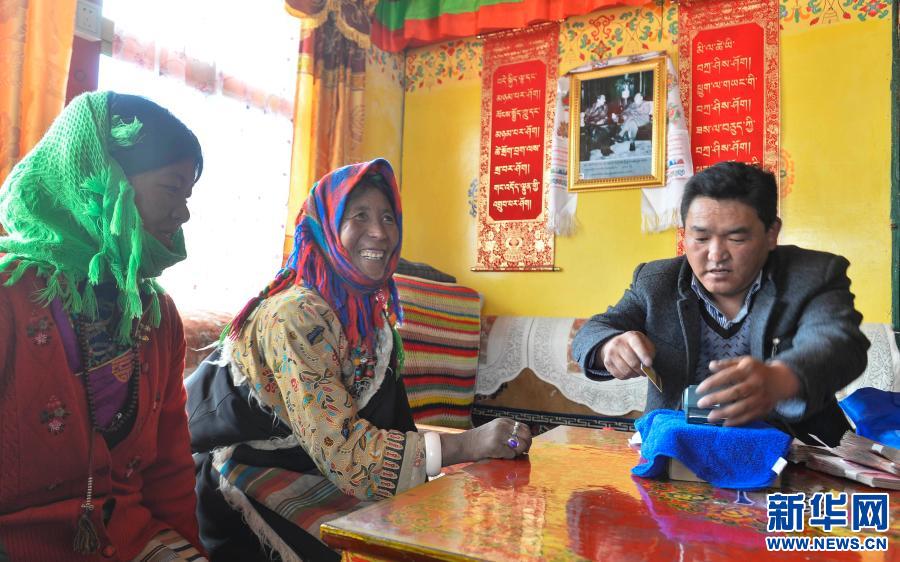 西藏日喀則市薩嘎縣達(dá)吉嶺鄉(xiāng)薩嘎村牧民在助農(nóng)取款服務(wù)點(diǎn)刷卡取款(2014年4月27日攝)。新華社記者 普布扎西 攝