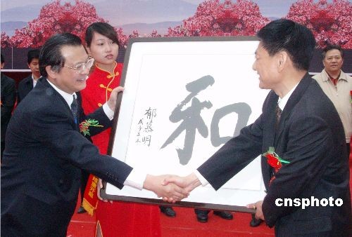 4月28日,臺灣新黨主席郁慕明親筆題寫的一幅“和”字,由湖南省臺辦副主任余一峰轉贈給湖南永州陽明山負責人,成為海峽兩岸血脈親情的又一見證。臺灣也有一座與湖南同名同姓的兄弟山——陽明山。 中新社發 傅煜 攝