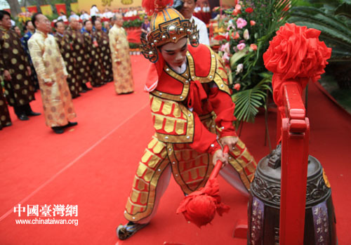 “鼓初嚴、再嚴、三嚴”,在大陸主祭人鄭家麟和臺灣主祭人、奉祀鄭成功聯合會理事長簡慶雄的率領下,兩岸52位陪祭、同祭人行禮如儀。國家文化部副部長趙少華、博鰲亞洲論壇秘書長龍永圖等,以及來自兩岸的數百位民眾亦全體肅立,向民族英雄致敬。