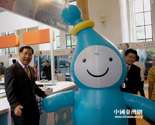 2009北京國際旅游博覽會今天開幕,圖為臺灣館內,高雄市政府觀光局局長林昆山和世運會吉祥物一道熱情邀請朋友們到高雄觀光。(中國臺灣網記者 張弛 攝)
